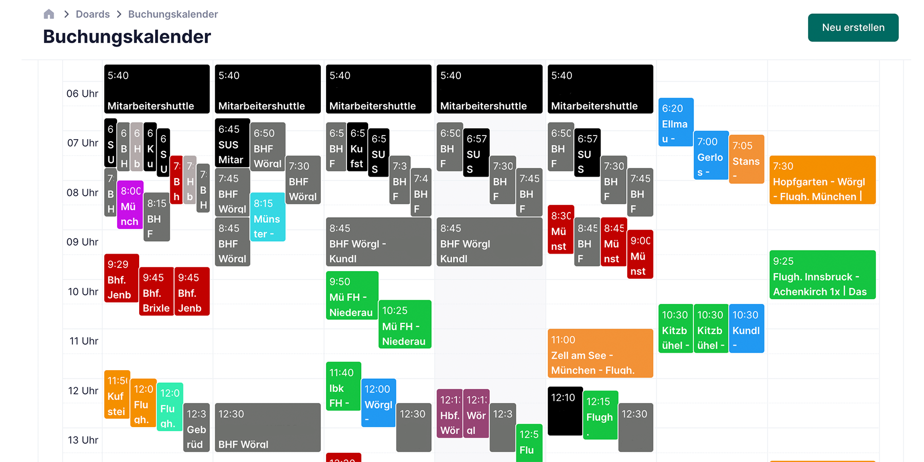 Funktion "Erstellen" oben rechts: Die Schaltfläche "Erstellen" oben rechts im Buchungskalender dient ausschließlich dazu, tägliche Fahrten einzutragen. Diese Einträge dienen lediglich zur Übersicht im Kalender und werden nicht als separate Buchungen erfasst. Es wird keine Buchungsnummer erstellt, und diese Fahrten sind auch nicht in den Buchungen zu finden. Bitte beachten Sie, dass für diese Einträge keine Rechnungserstellung möglich ist.